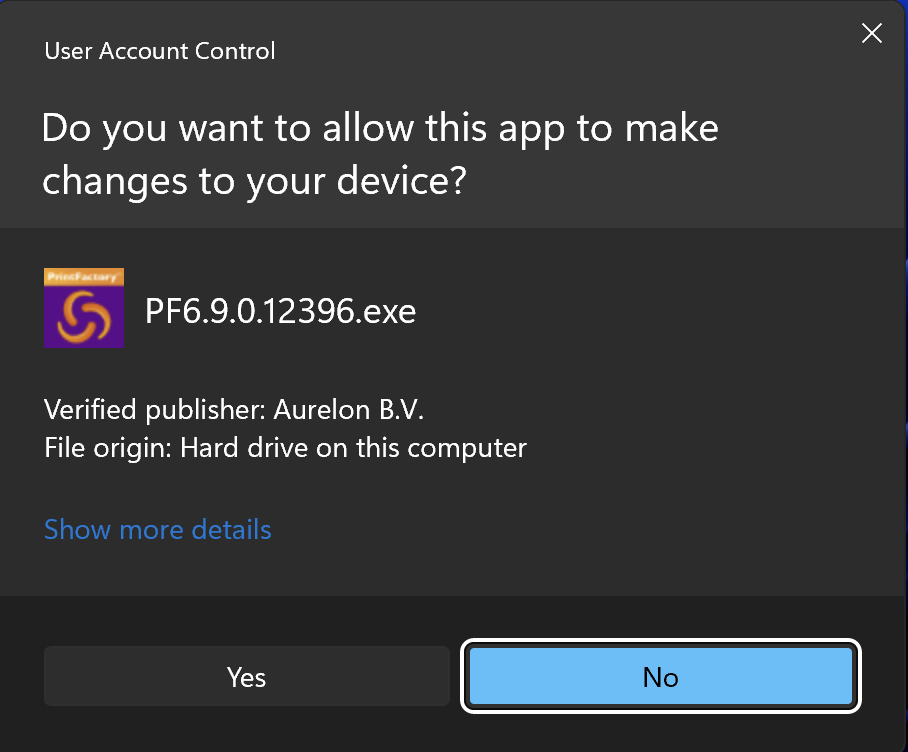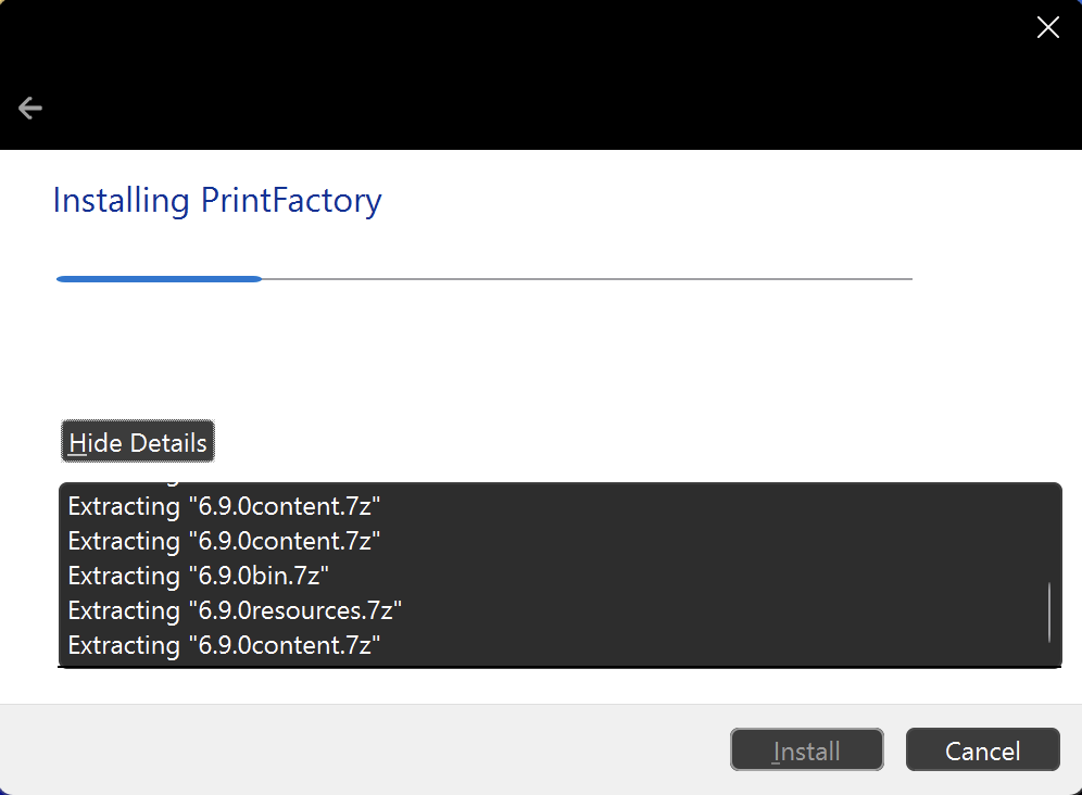 5. The installation will install all PrintFactory components. The installation path is C:\Program Files\PrintFactory. Depending on your system (32 or 64 bits), the folder may vary; for example, C:\Program Files (x86).