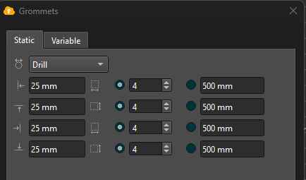 In the Grommets workflow step, set Grommet Type to Drill. Configure spacing and offsets as required.