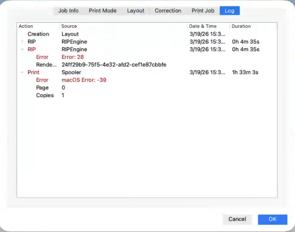 When you see Error 28 in Processing tab, followed by an macOS error -39 in spooling tab in the RIP on Mac, this points to disk full.