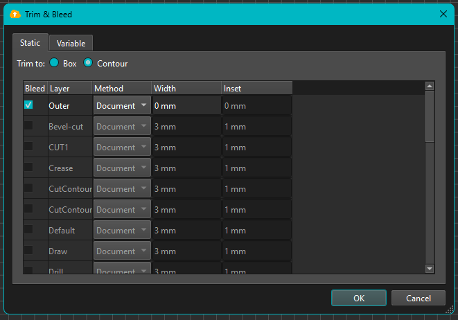 Cut Contours: If you are generating a cut contour or mapping a spot color to a cut path, this must be performed prior to the Trim & Bleed step in your Workflow
