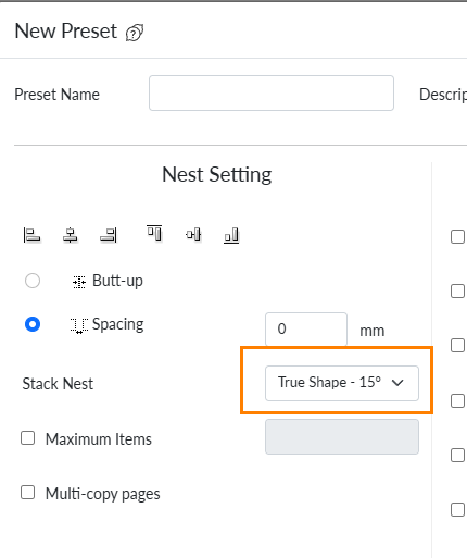In your Nest queue settings, navigate to the nesting presets and select a True-Shape algorithm. This ensures the engine calculates placement based on "Nest Shape" geometry.